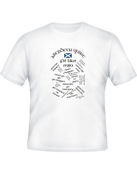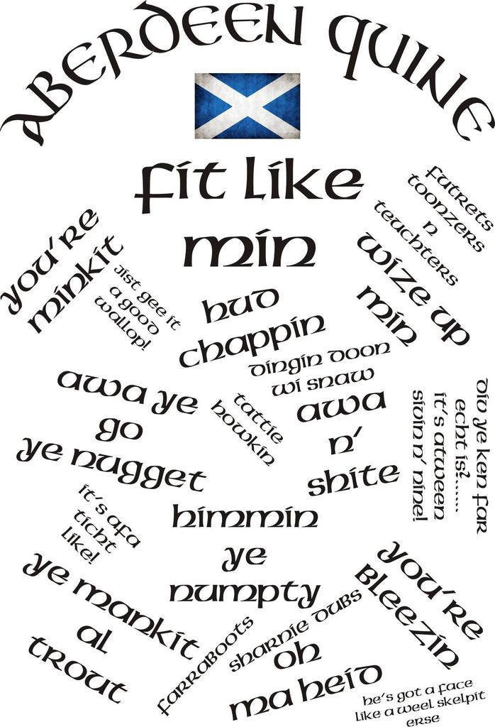 It's a T-Shirt for a "Quine" (Doric word for Girl here in Aberdeen)  with a few Doric and slang sayings you may hear from time to time if you ever visit Aberdeen and the North East of Scotland. Doric refers to the dialects of Scots spoken in the northeast of Scotland.