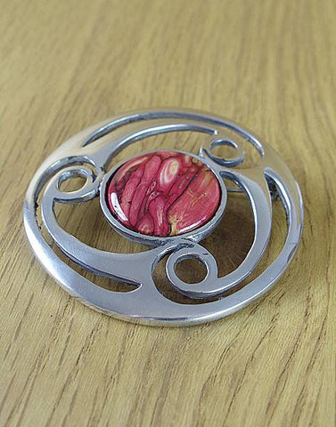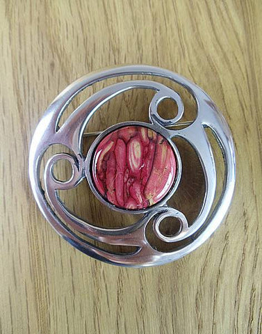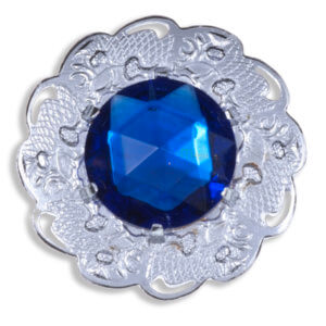 Disc stone brooch – A round chrome brooch with thistle embellishment and a large central glass sapphire coloured stone setting. Secures to a garment by way of a pin with locking, safety catch.