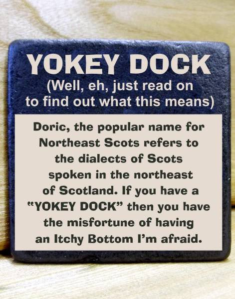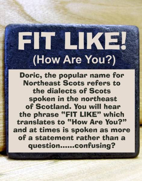 Chunky Natural Stone Slate Coaster with rustic edge laser engraved with Doric Dialect that you may hear from time to time if ever visiting Aberdeen & the North East of Scotland. Each stone coaster/plaque is also coated with a clear protective coating so that they can easily be wiped clean. Rubber pads to rear.