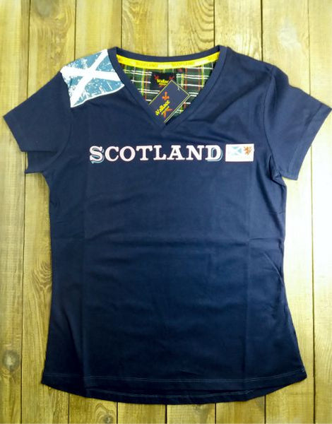 Scotland Ladies Navy V-Neck T-shirt with Saltire trim.