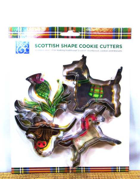 Four piece cookie cutter set with a Highland Cow, Scottie Dog, Unicorn and a Thistle.