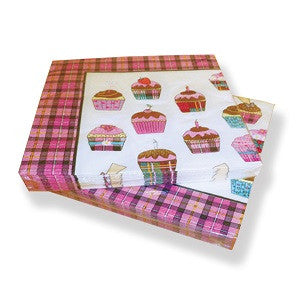 20 Luxury triple ply paper napkins with various cup cake designs and a tartan trim.