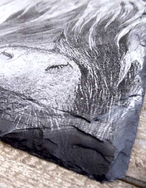 Thick, chunky, rustic slate wall plaque with metal hanging loop to rear for easy wall mounting. The Wee Coo featured on this slate plaque is a piece of work by local artist Margaret Burns Miles